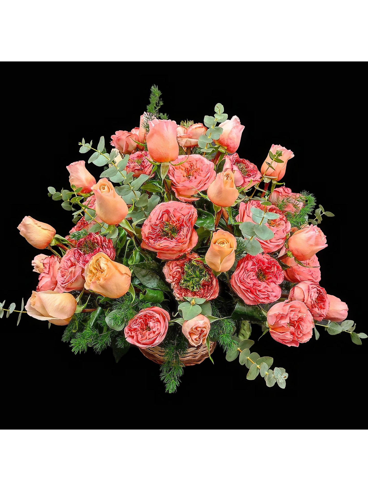 ¡Haz que tus seres queridos se sientan especiales con nuestra Cesta mandarín expression! Esta hermosa cesta está compuesta de 48 rosas garden rosas naturales, frescas y exquisitas complemnetada de follajes importados y eucaliptus, creando un regalo perfecto para cualquier ocasión.