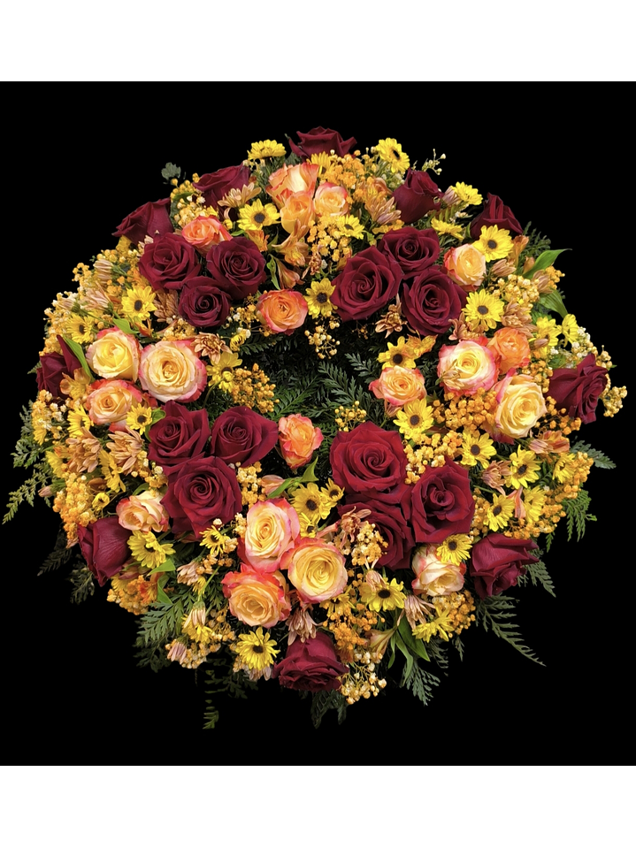 Bella corona de condolencias en rosas rojas y cremas, con margaritas en amarillos y gipsofilas delicadamente pigmentadas en tonos anaranjados, sobre atril alto.