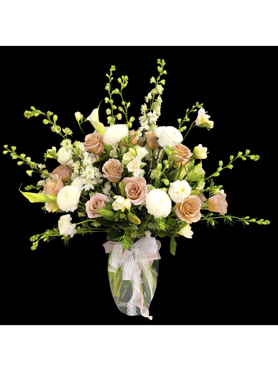 Este impresionante florero presenta 25 tallos de rosas en tonos chocolate, complementados con delicados delfinios blancos y cremones importados. Las flores de estación y las finas cintas añaden un toque de elegancia, creando un impacto visual que sorprende a quien lo recibe. Este diseño es perfecto para demostrar amor en un aniversario o para expresar sentimientos hacia esa persona especial en tu vida. Con su combinación de colores y texturas, este florero no solo es un regalo, sino una obra de arte floral que dejará una impresión inolvidable. Ideal para cualquier ocasión romántica, este arreglo permitiría comenzar o culminar un momento memorable.